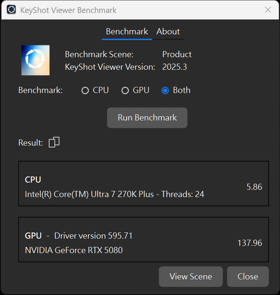 KeyShot 為 Luxion 所開發的 3D 渲染軟體,提供快速鍵購逼真的 3D 模型影像,並以直覺式介面與即時渲染而出名;KeyShot 預設使用 CPU 進行渲染,並支援 GPU 加速等渲染功能,且在 KeyShot Viewer 檢視軟體中,也有提供 Benchmark 功能;而KeyShot Benchmark 基準分為 1,測試分數越高代表性能越好。