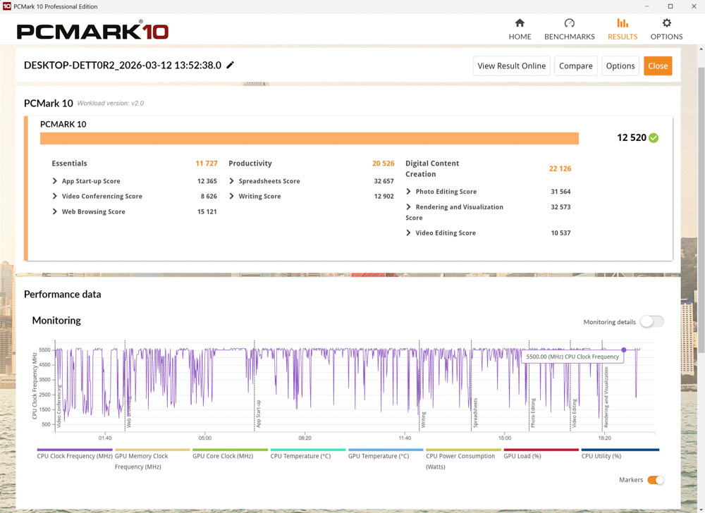 270K Plus 總計獲得12520分,其中電腦基準性能 Essentials 有著 11727 分;生產力則為 20526 分;而在更依賴 CPU 運算的數位內容創作測試中,取得 22126 分的成績表現;根據記錄資料,顯示測試時 CPU 時脈最高可達 5.5GHz (P-core;效能核心),基本已達表定的Turbo時脈上限。