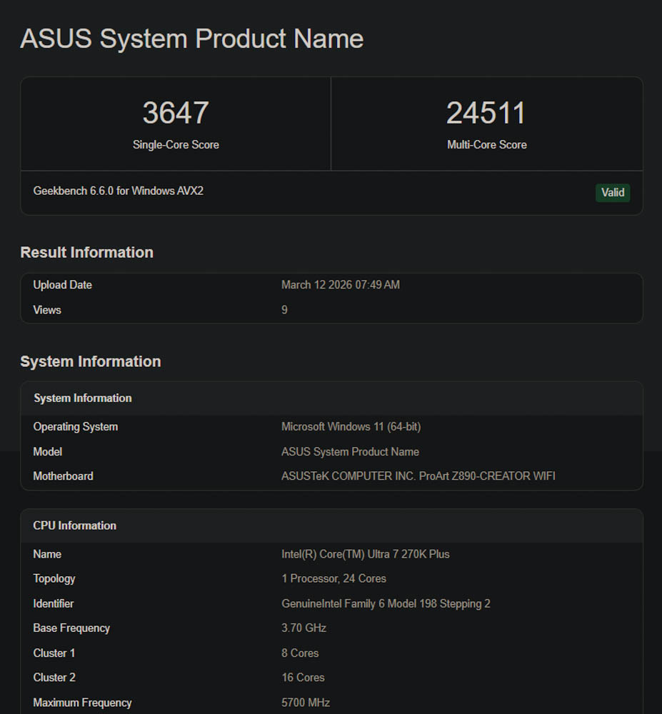 ↑ 好U配好板,Intel Core Ultra 7 270K Plus 搭 ASUS ProArt Z890-CREATOR WIFI