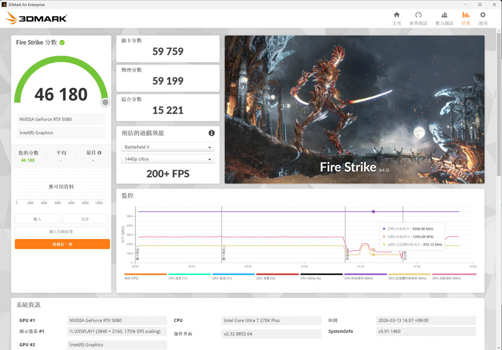 270K Plus 在 Fire Strike 物理運算測試,獲得 59199 物理分數,總計 46180 分的成績表現。