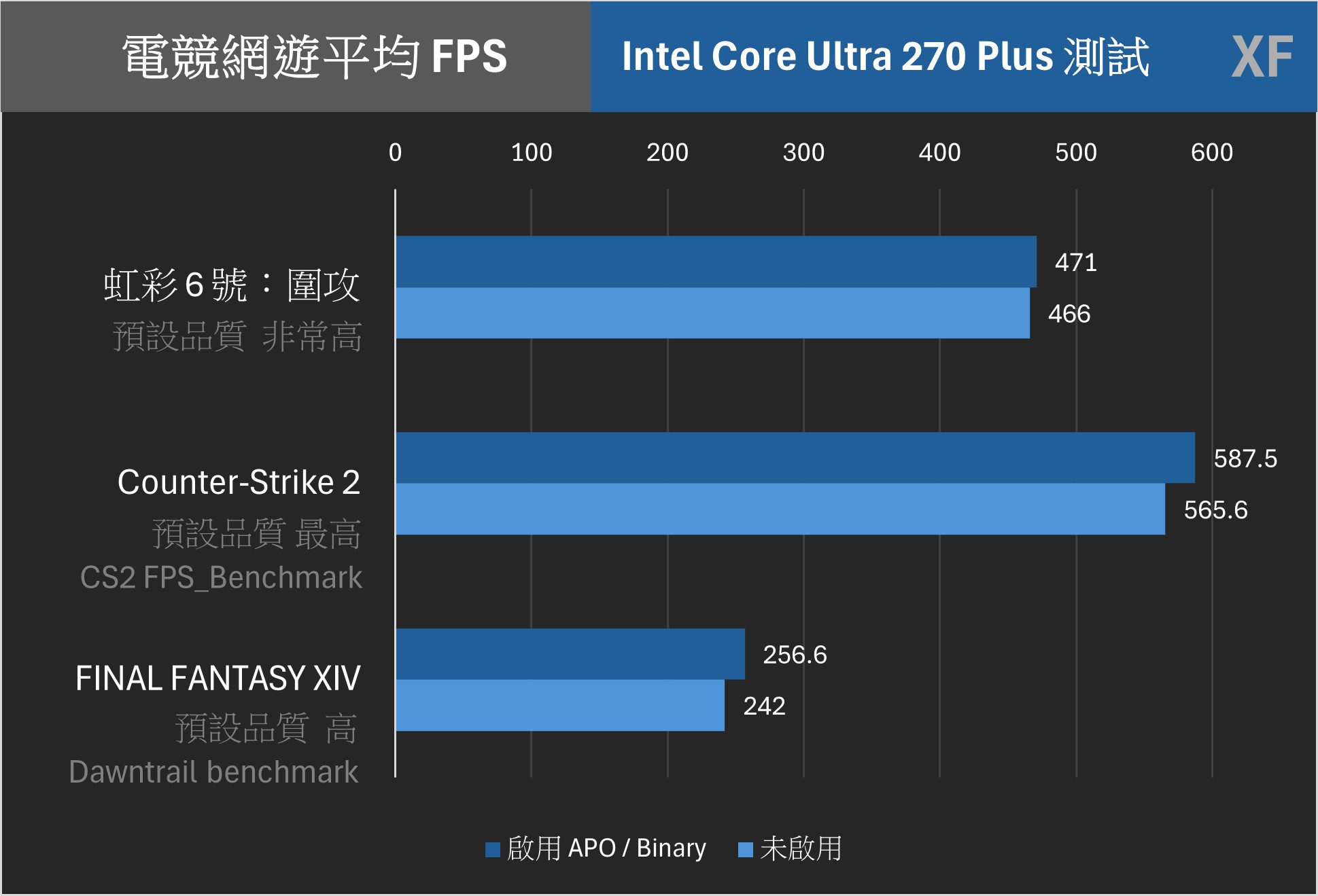 其中《Counter-Strike 2 (CS2)》與《Final Fantasy XIV (FF14)》作為 Intel 最佳化支援的遊戲,在啟用 APO + Binary Optimization Tool 後,FF14 可來到 256.6 FPS,有著 5.7 % 效能提升、CS2 也提升3.7 %,來到 587.5 FPS;這顯示 Intel 最佳化支援,可作為進一步提升遊戲體驗的增強工具。