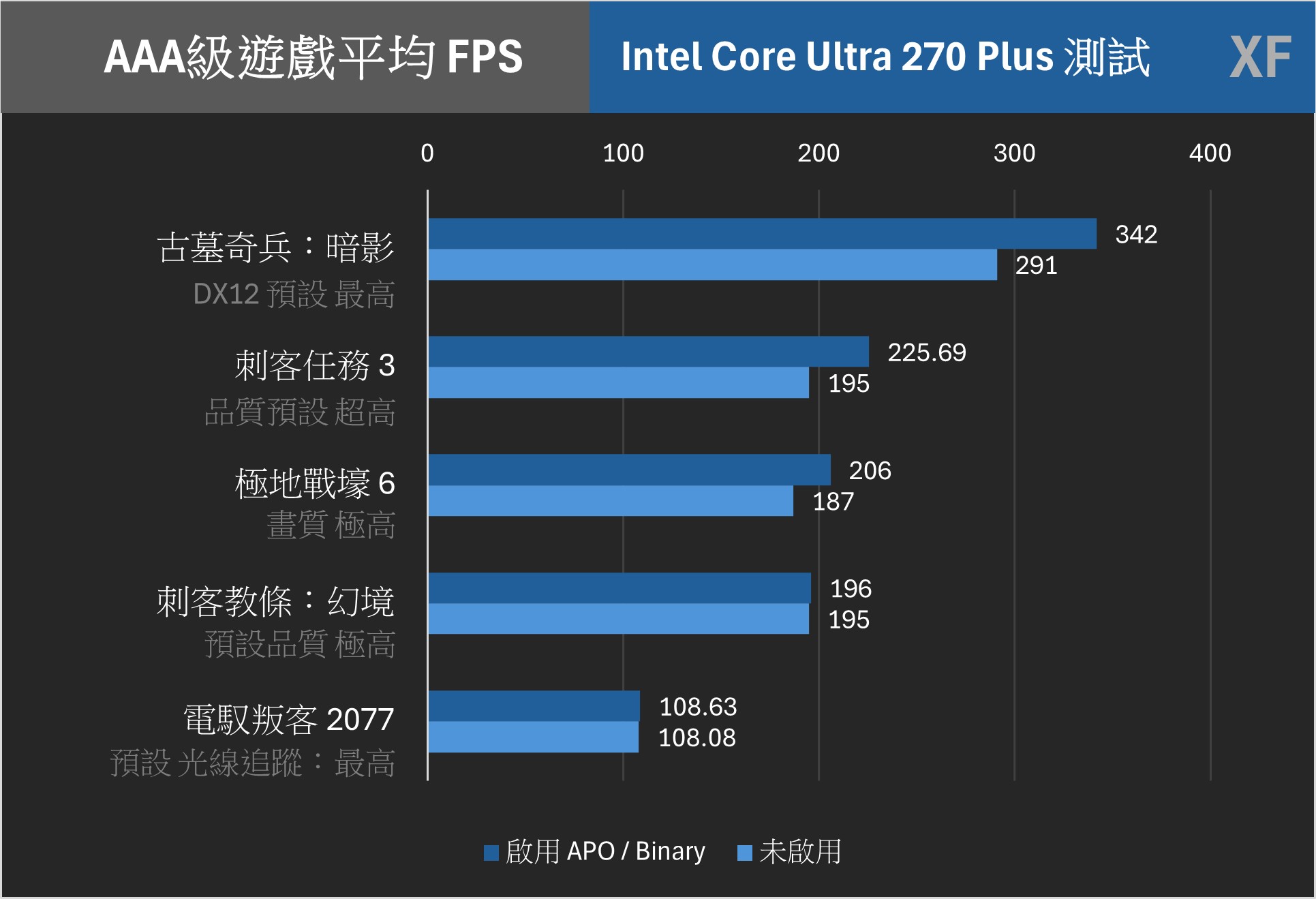 透過 APO 與 Binary Optimization Tool 的 Intel 最佳化支援,《古墓奇兵:暗影》進一步提升 14.9% / 342 FPS、《刺客任務 3》提高 13.6% / 225.69 FPS、《極地戰壕 6》提高 9.2% / 206 FPS;可見 Intel 最佳化支援,對於部分經典 3A 遊戲來說,有著不錯的輔助提升。
