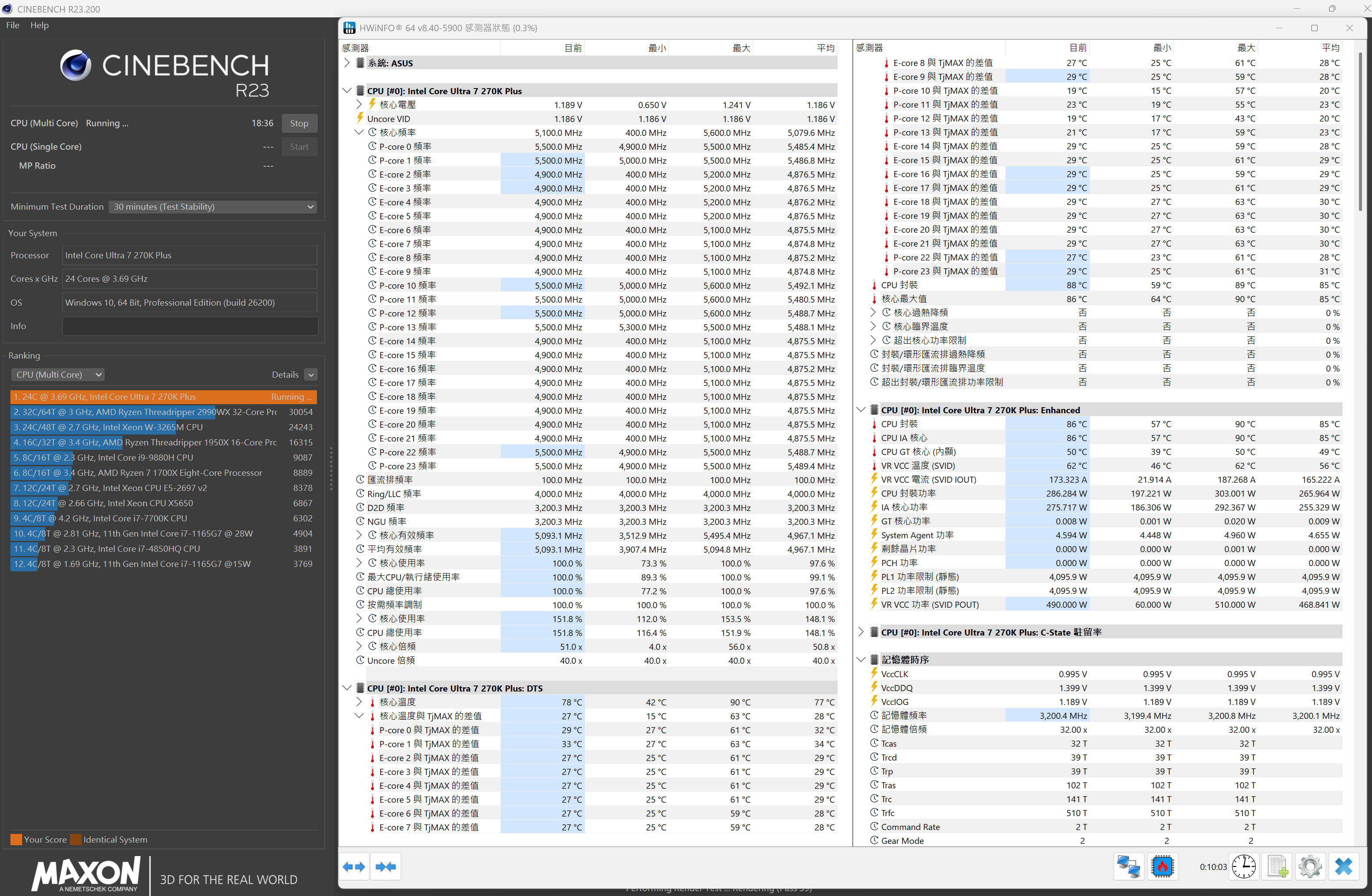 溫度與功耗部分,Intel Core Ultra 7 270K Plus處理器,搭配ASUS Prime LC 360 ARGB水冷散熱器,並解鎖功耗與115 °C溫度限制;經過 Cinebench R23 壓力測試,其CPU 溫度可穩定壓在 85°C、功耗最高來到 303W、平均 265.964W 左右,並有著平均 P-core 5.5GHz、E-core 4.8GHz的全核心時脈效能。
