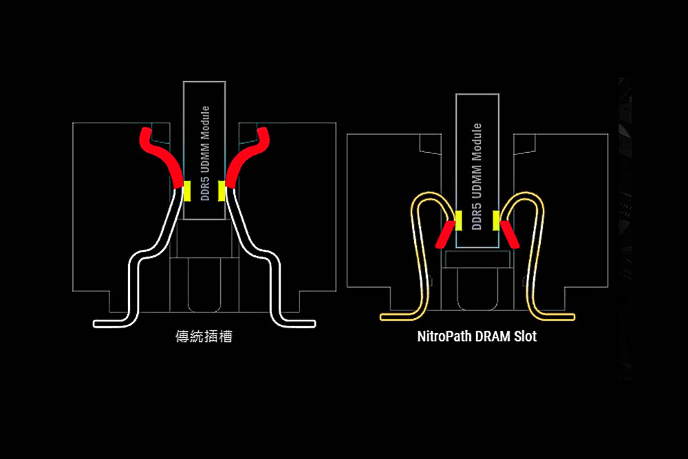 主板右上區域,配有4 DIMM DDR5 NitroPath 記憶體插槽,採用NitroPath設計,將插槽內部針腳長度優化,形成倒鉤造型,進而強化記憶體安裝的穩固性,相較傳統設計帶來400MT/s 記憶體超頻空間;同時支援 256GB 最大容量擴充,以及高達 CUDIMM DDR5 9200+(OC)的超頻表現。