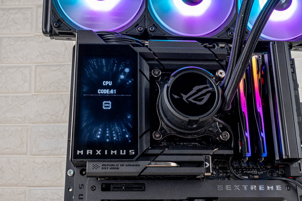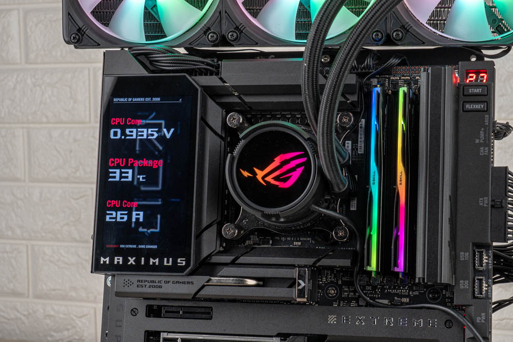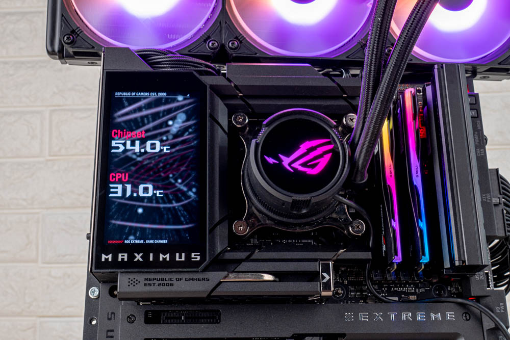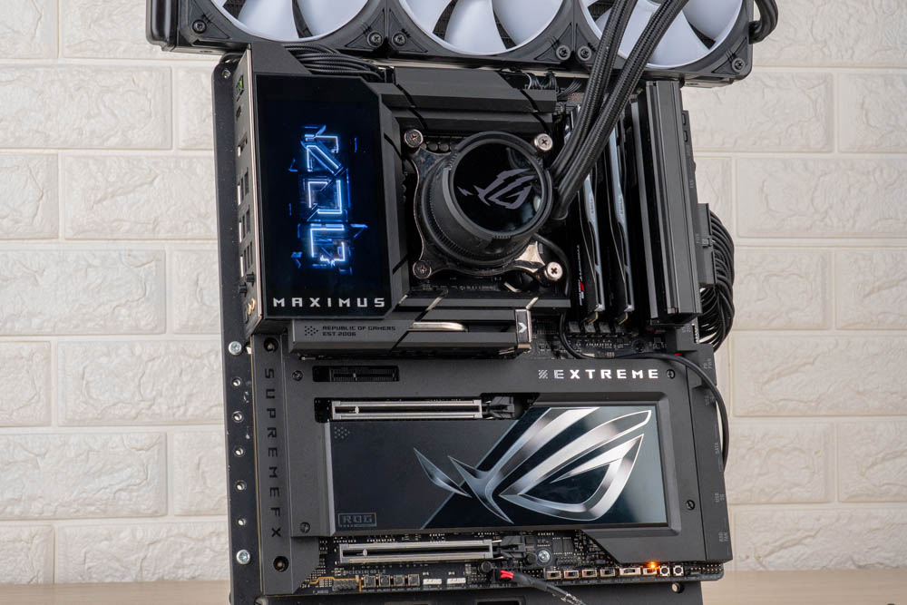 筆者也透過實機展示,將 ROG MAXIMUS Z890 EXTREM 實際燈效圖,供各位玩家參閱;並且使用 ROG Strix LC III ARGB AIO 水冷作為視覺搭配,與後續效能測試為用。