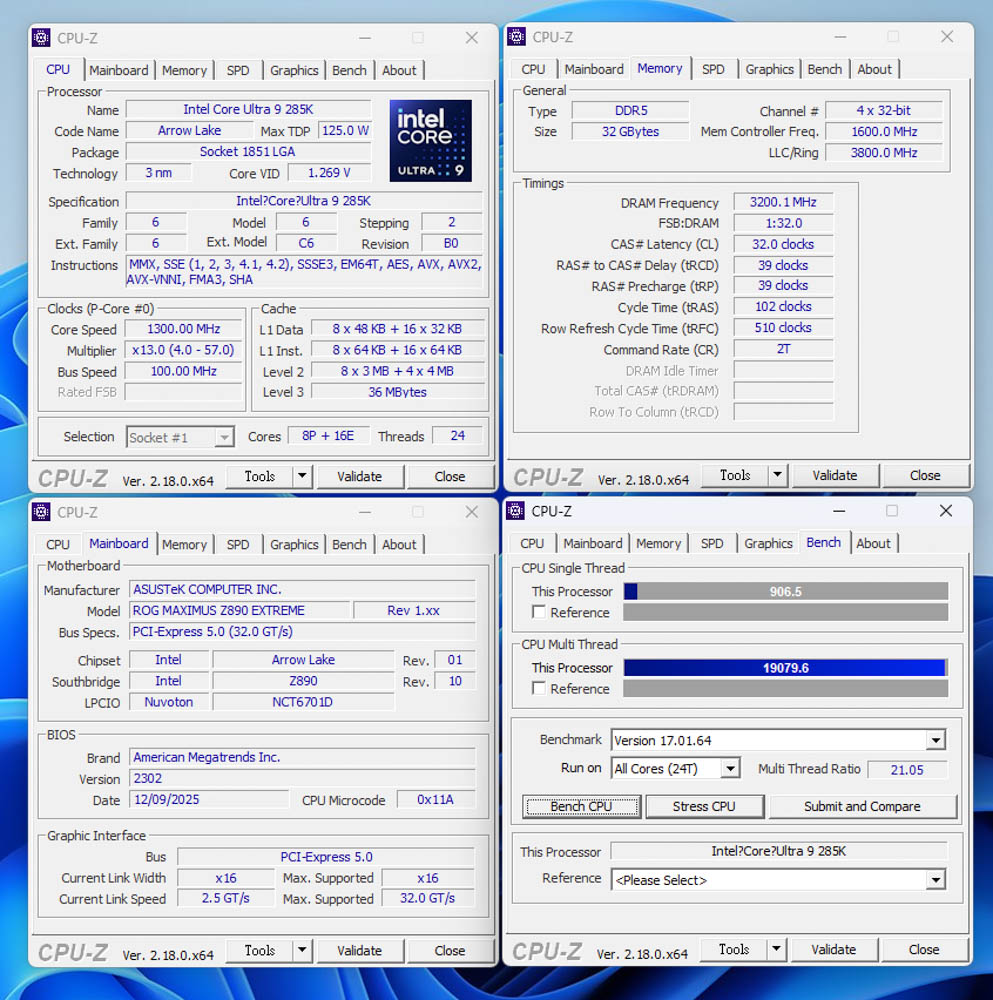 首先CPU-Z 驗證,當前所使用的硬體資訊,CPU Intel Core Ultra 285K,代號 Arrow Lake 採用 3nm 製程處理器;具備 8P+16E 的 24 核心 24 執行緒;搭配主機板 ROG MAXIMUS Z890 EXTREME、BIOS 2302 版本;記憶體為 Trident Z5 Neo RGB DDR5 UDIMM 16GBx2 6400。