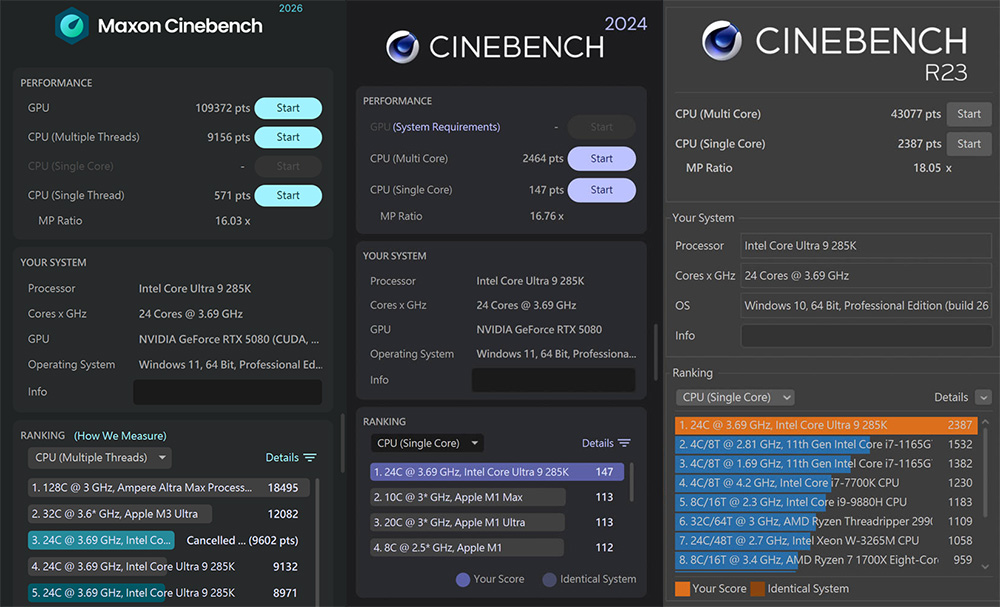 Intel Core Ultra 285K 在全新 2026 版本獲得CPU nT 9156 pts、1T 571 pts;2024 版本 CPU nT 2464 pts、1T 147 pts成績;R23 版本 CPU nT 43077 pts、1T 2387 pts 測試成績。