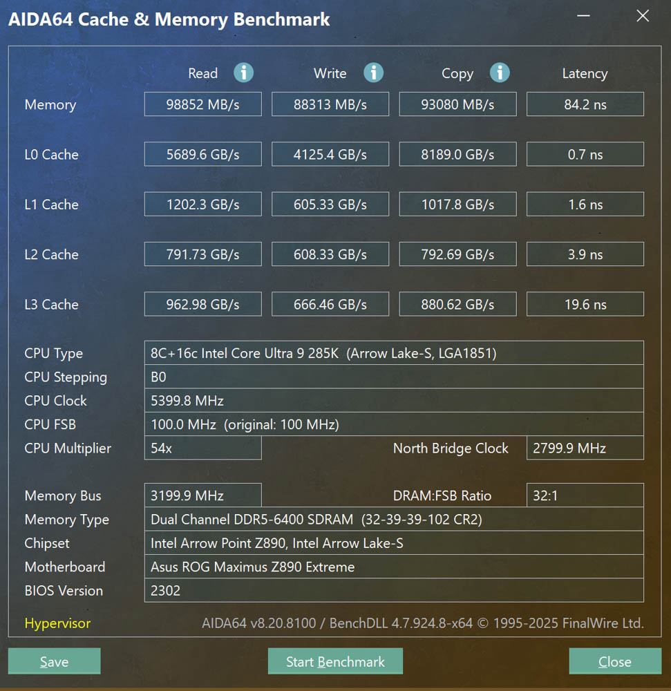 AIDA64 記憶體與快取測試,記憶體使用 G.Skill DDR5 2x16GB 6400MTs (開啟EXPO),測試成績為讀取 98852 MB/s、寫入 88313 MB/s、複製 93080 MB/s、延遲 84.2 ns的效能表現。