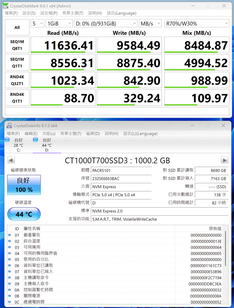 使用 CrystalDiskMark 測試Blazing M.2搭配散熱片的讀寫表現,採用PCIe Gen5 SSD Crucial T700作為資硬碟來進行測試,結果可達到循序讀寫 11636.41 MB/s、9584.49 MB/s的傳輸效能。