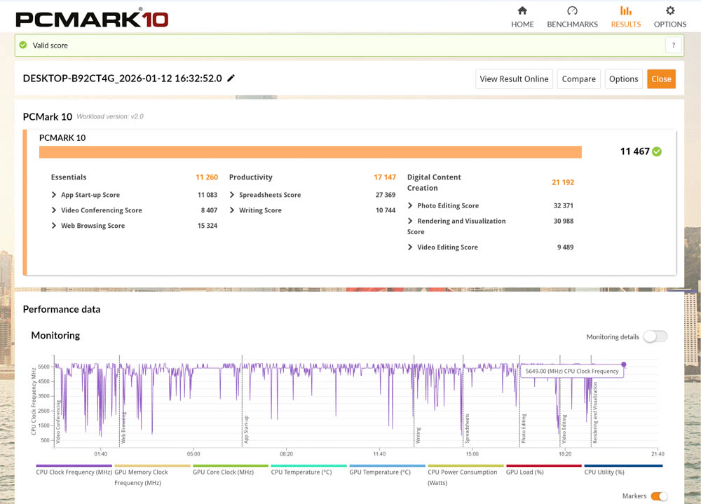 Intel Core Ultra 285K 搭配 RTX 5080 FE 獲得 11467 分,電腦基準性能 Essentials 有著 11260 分,生產力則有 17147 分,在更需要 CPU 運算的數位內容創作獲得 21192 分的高成績。