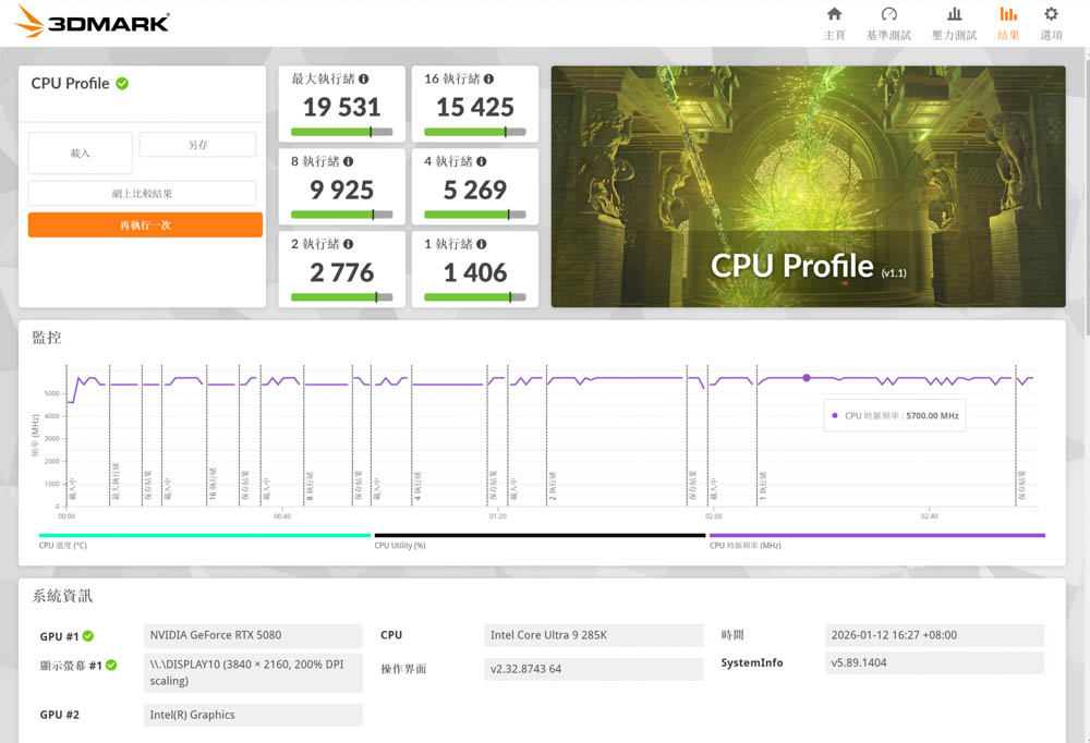 Intel Core Ultra 285K 最大執行緒達到 19531 分的成績,勝任電影CG等級的渲染運算、真實物理模擬與科學分析等專業創作需求;而遊戲方面,則取得 8執行緒 9925 分、4執行緒 5269分。