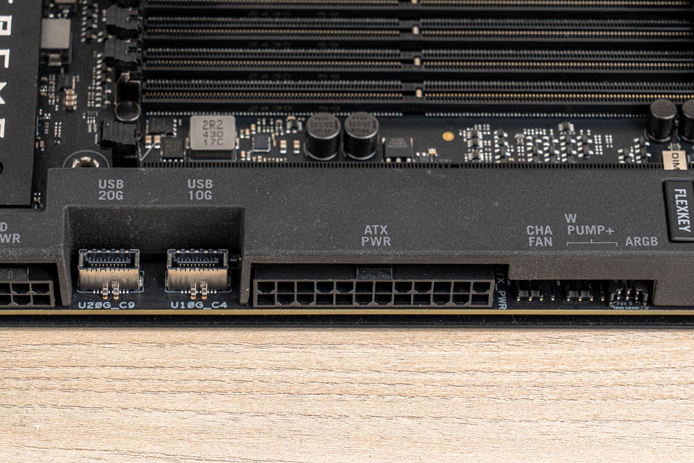 而主板右方常見的 ATX 24-pin 供電,與前置 USB、ARGB、FAN各類擴充,採用水平式接頭,搭配護背外殼與標示,可直觀識別各位置,並帶來更清爽的視覺表現;如下圖所示,有著ARGB 6-Pin、四個風扇/水泵擴充、ATX 24-Pin 供電,以及各類前置USB與SATA擴充接頭。