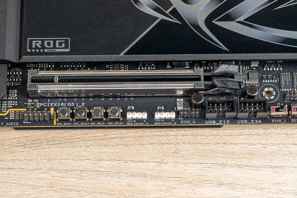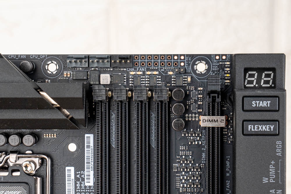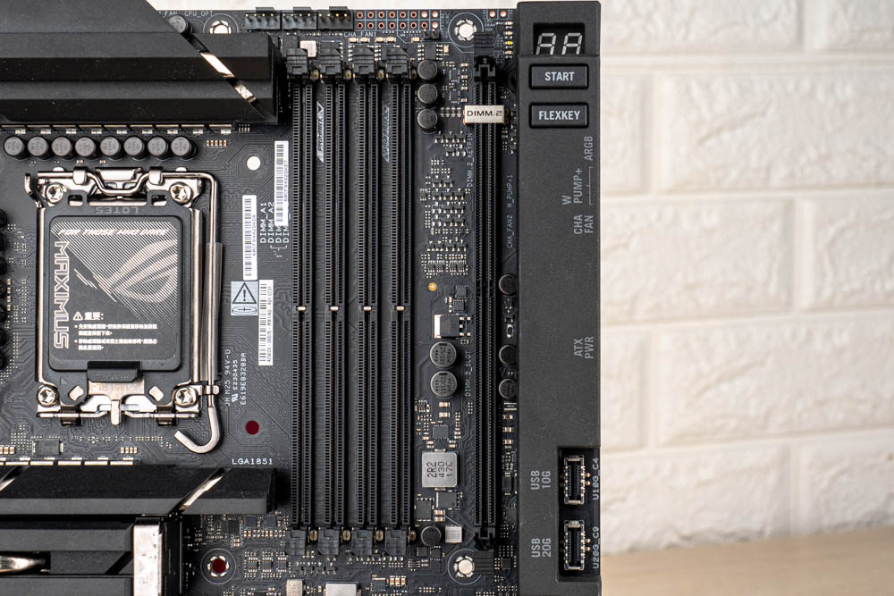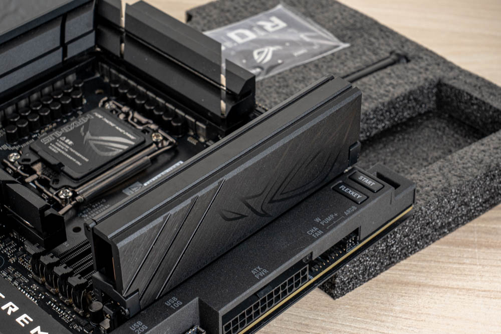 此外,還配置有DIY友善設計的ROG Q-DIMM.2擴充卡槽,設於記憶體旁邊,可再增加 2 條 PCIe 4.0 M.2 SSD,實現共6條 M.2 SSD 的安裝空間 ;並且設有 2個風扇與水泵插座,以及Probelt 測量點位、Q-LED 與 Q-Code 除錯功能、開機 / FlexKey鍵,方便玩家快速對故障做檢測調整。