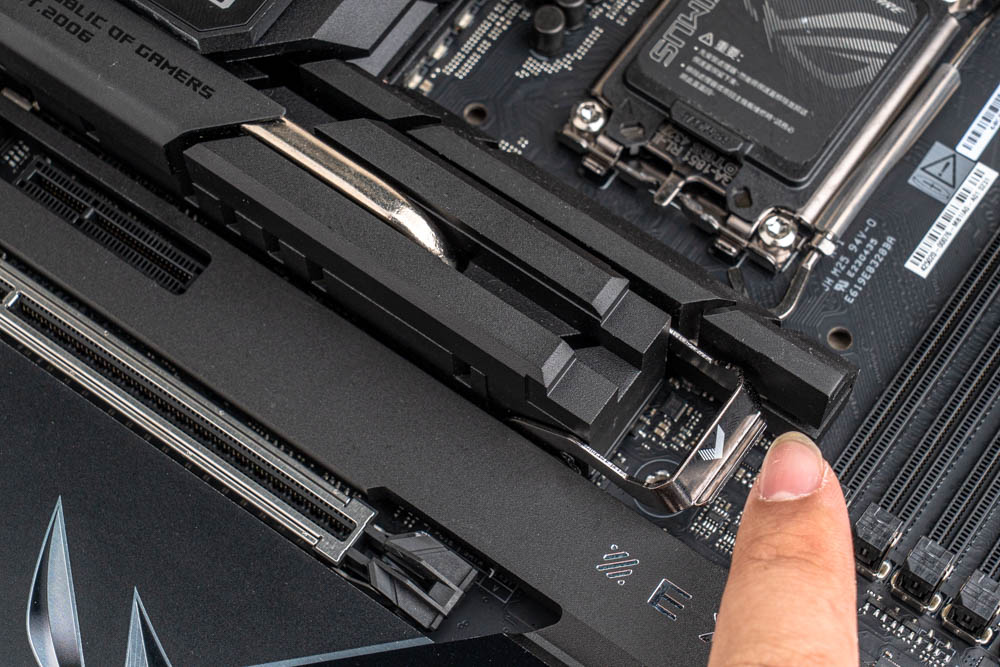 M.2拆裝上,分有獨立快拆的3D均溫板散熱器(上方),與鎖孔固定的大面積散熱裝甲(下方),這兩大區域;首先 M.2_1 位於上方3D均溫板散熱器,其次 M.2_2、M.2_3、M.2_4則位於下方鎖固的散熱裝甲;皆設有DIY 友善安裝 M.2 Q-Slide / Latch,以及雙面導熱墊來輔助散熱。