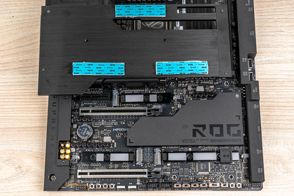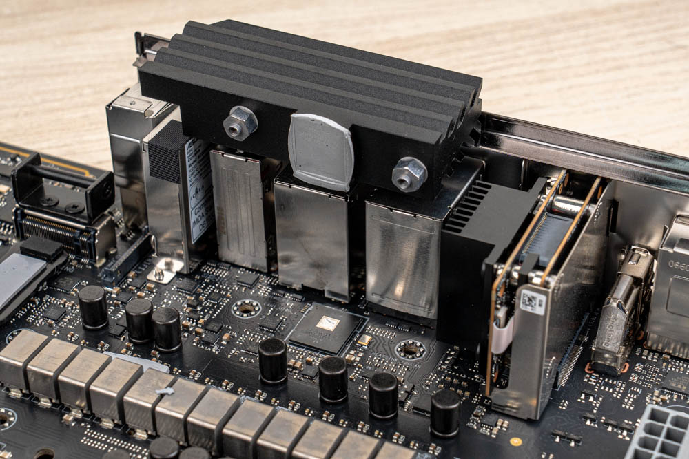 主板正面的散熱器,與背板同樣有著針對M.2擴充、10GbE LAN、VRM與晶片組等特定元器件,各增設有加強導熱墊來輔助散熱。