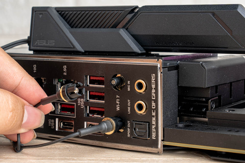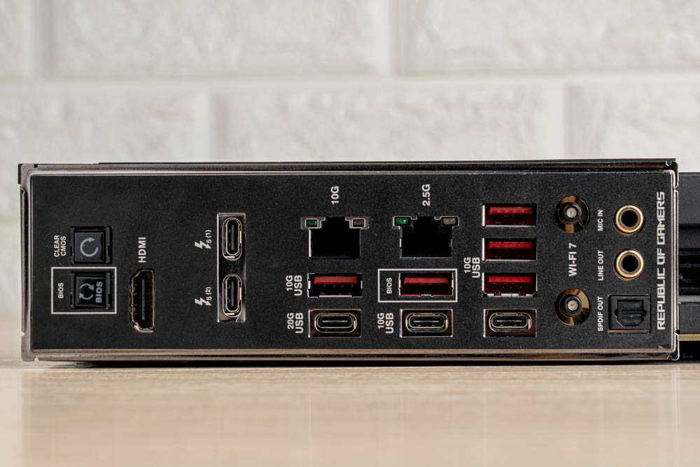 並且提供Wi-Fi 7天線、2.5GbE LAN 與 10GbE LAN雙RJ-45網路,以及3.5mm與 SPDIF音訊輸出 / 輸入等常見連接埠;此外,標有「白色框線」的USB連接埠,則為BIOS Flashback專用,方便玩家更新BIOS。