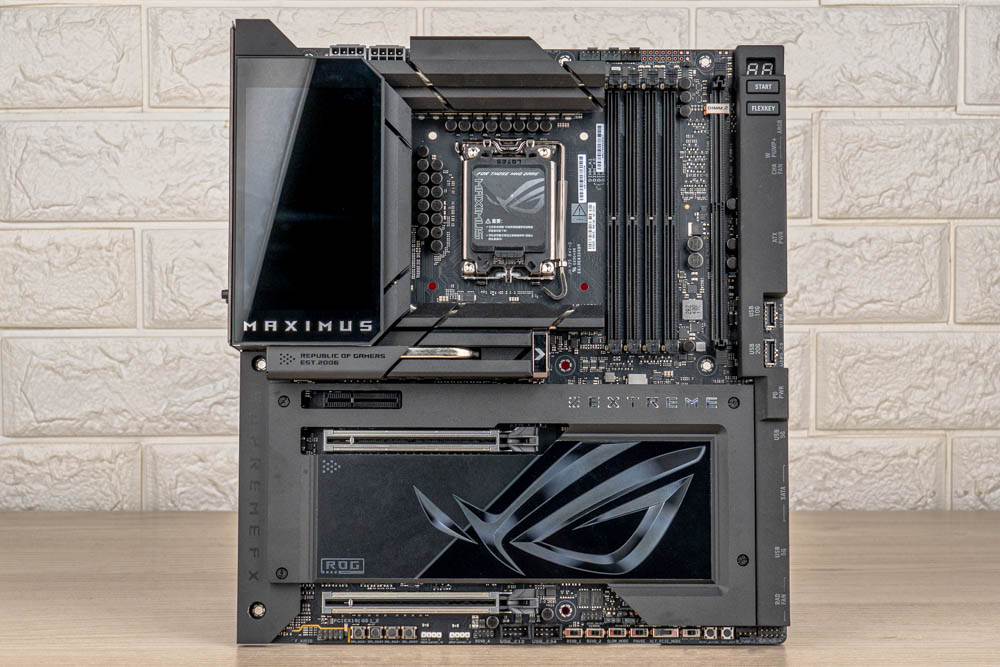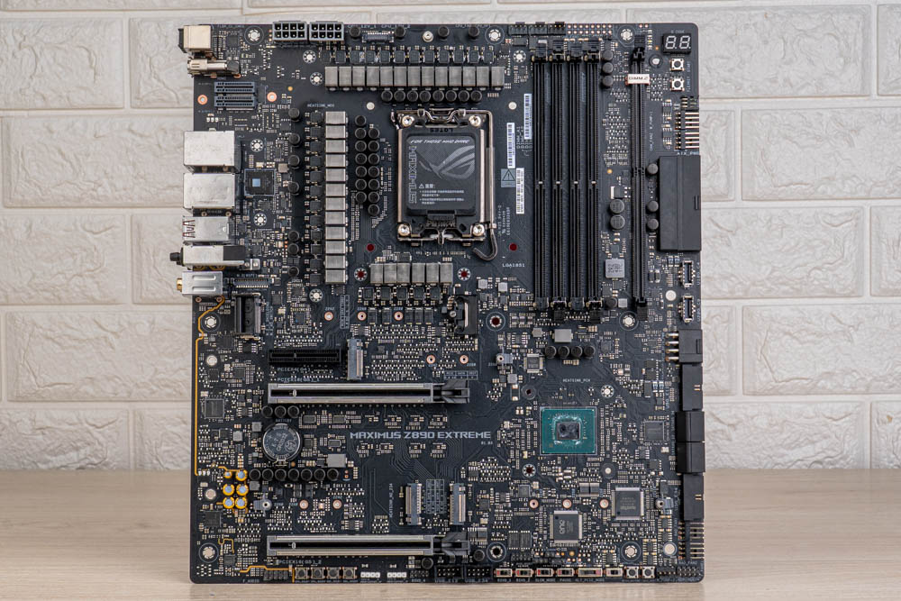 ↑ ROG MAXIMUS Z890 EXTREME正面,有著將空間善用到極致的PCB設計。