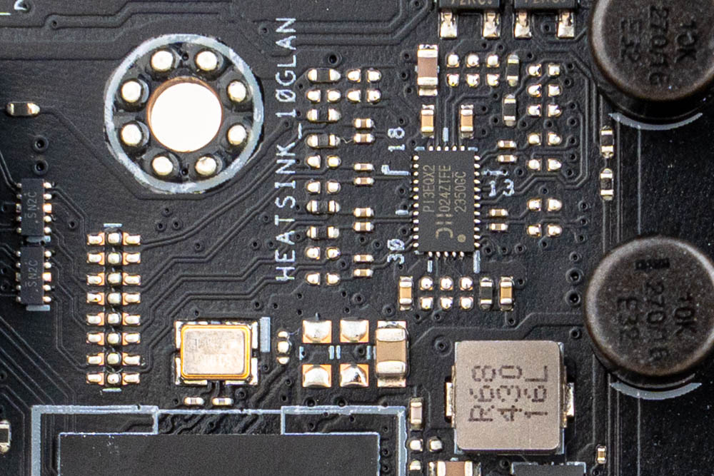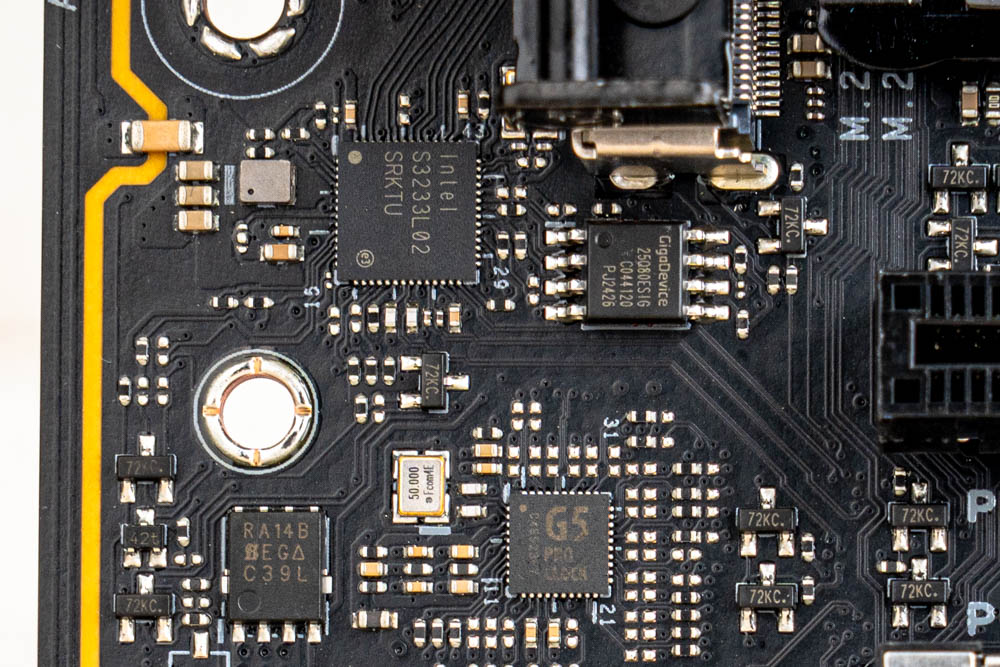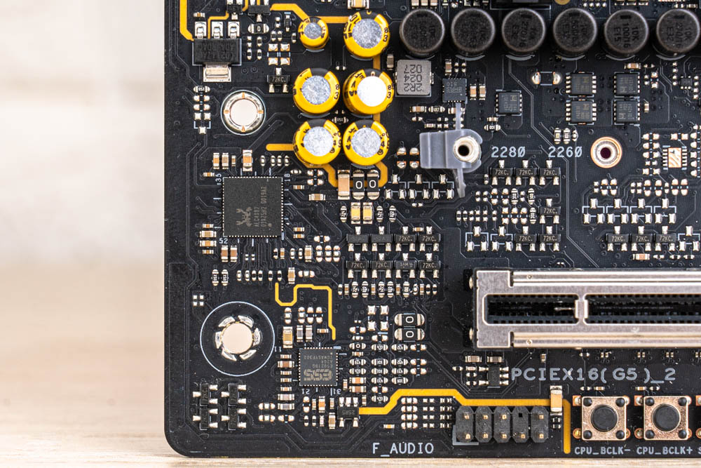 ↑ 2.5GbE LAN 網路採用 Intel I226-V 控制器 (上);G5 PRO CLOCK時脈產生器 (下),提供主板底部的CPU_BCLK + / – 按鈕調節功能 。