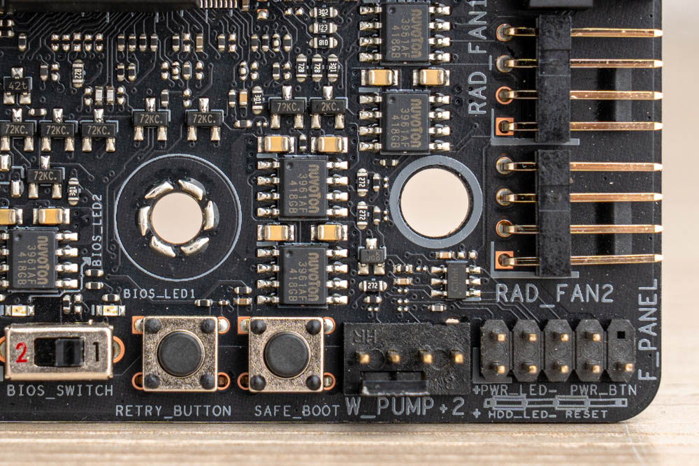 ↑ 主板下半部,有著PCIe插槽、M.2插座與散熱器、常見連接埠與功能開關。