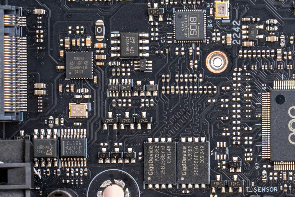 ↑ 雙 BIOS ROM 設計,採用兩顆 GigaDevice GD25B256EYIG NOR 快閃記憶體 (下);搭配華碩 BIOS Flash Back AI1315-B1晶片 (上)