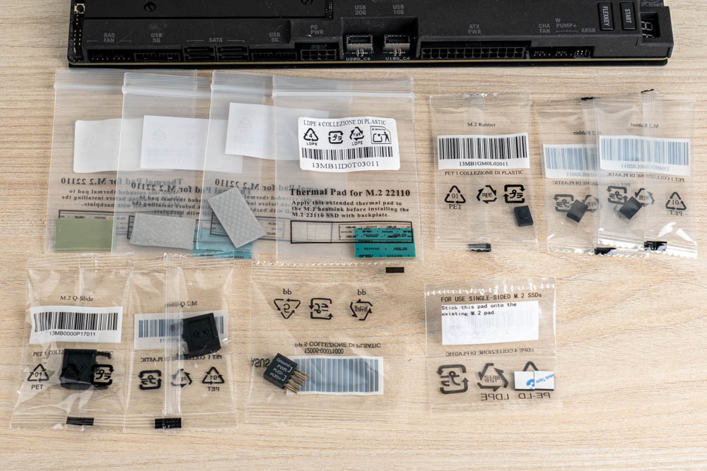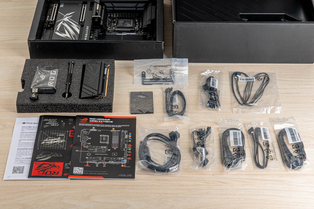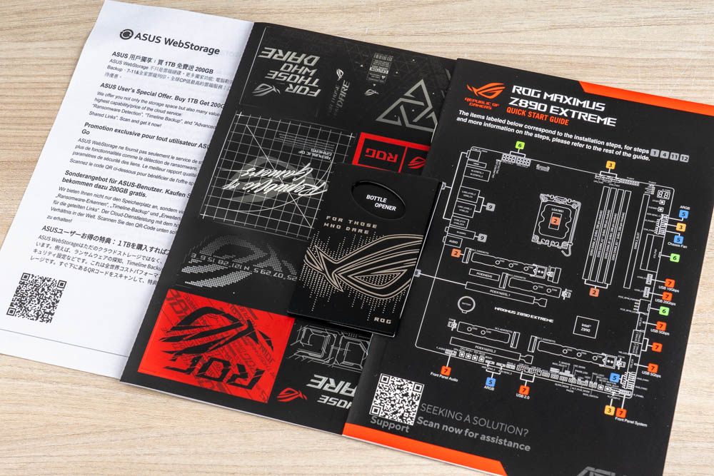 隨附物品:說明書組、開瓶器、螺絲起子、隨身碟、DDR5 風扇支架、 2 x SATA 數據線、2 x ARGB 分接線 ( 1 拖 2 / 1 拖 3 )、2 x FAN 分接線、1 x熱敏電阻線、WiFi-7 天線、ROG Q-DIMM.2、備用快拆、支撐與導熱墊