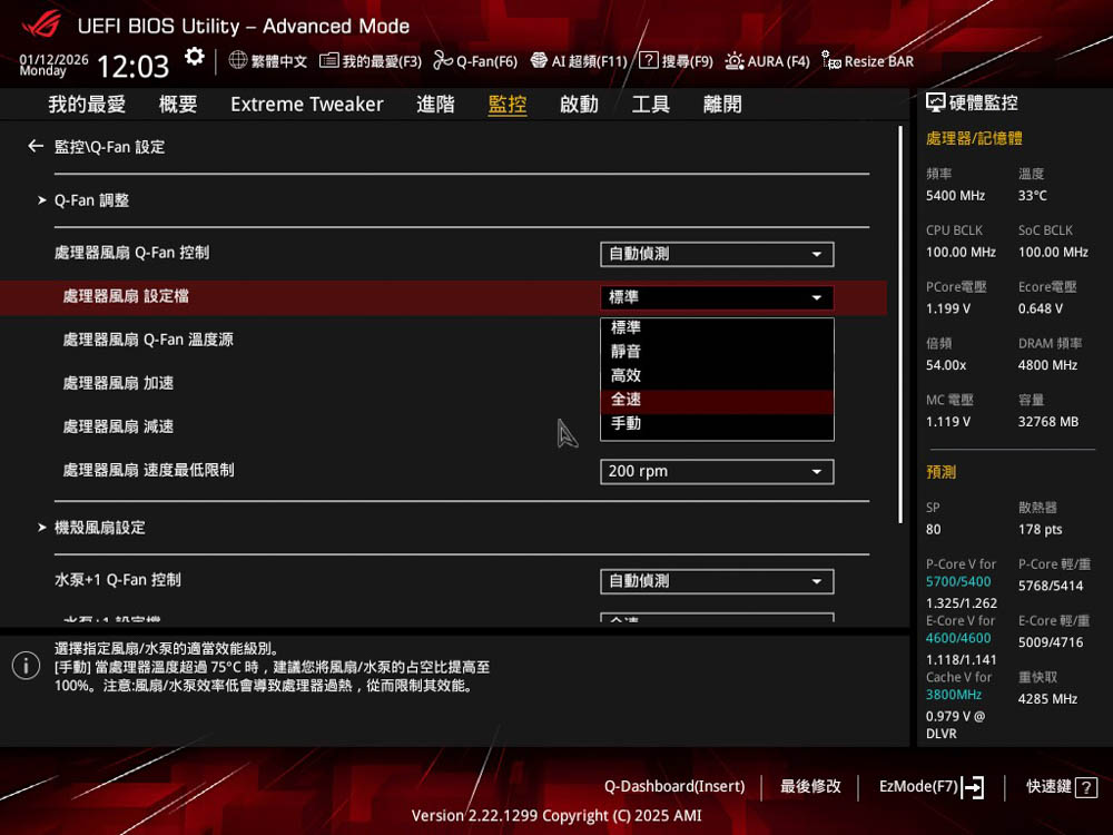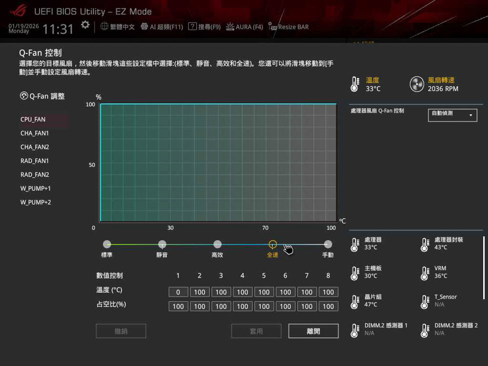 ↑ 會接續跳轉至相應功能 Q-Fan,提供風扇相關調整,筆者這裡設置為風扇全速模式。