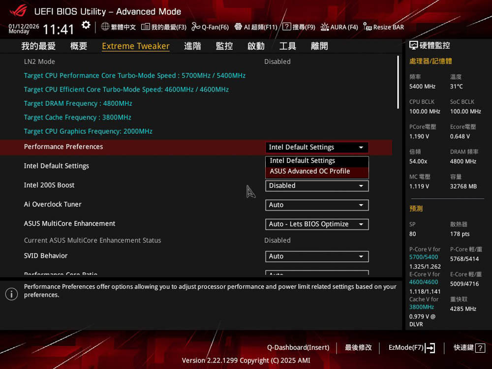 此外,如果想解鎖 Intel 預設功耗、電流限制,除了手動設定外,也可以透過 Performance Preferences選項,並設定為 ASUS Advanced OC Profile,即套用華碩進階 OC 參數,藉而解除 Intel 預設的參數限制 (PL1 / PL2 / ICCMAX)。