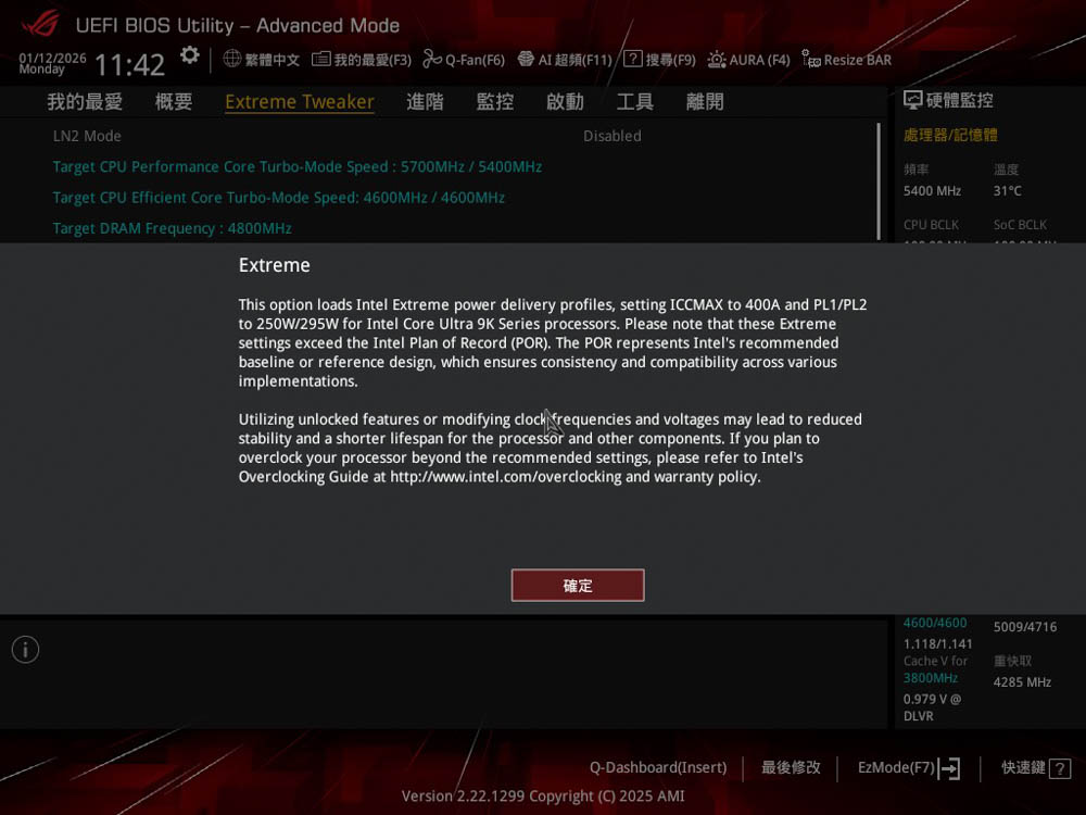 ↑ 設定為 ASUS Advanced OC Profile,會跳出PL1 / PL2 / ICCMAX參數相關警示。
