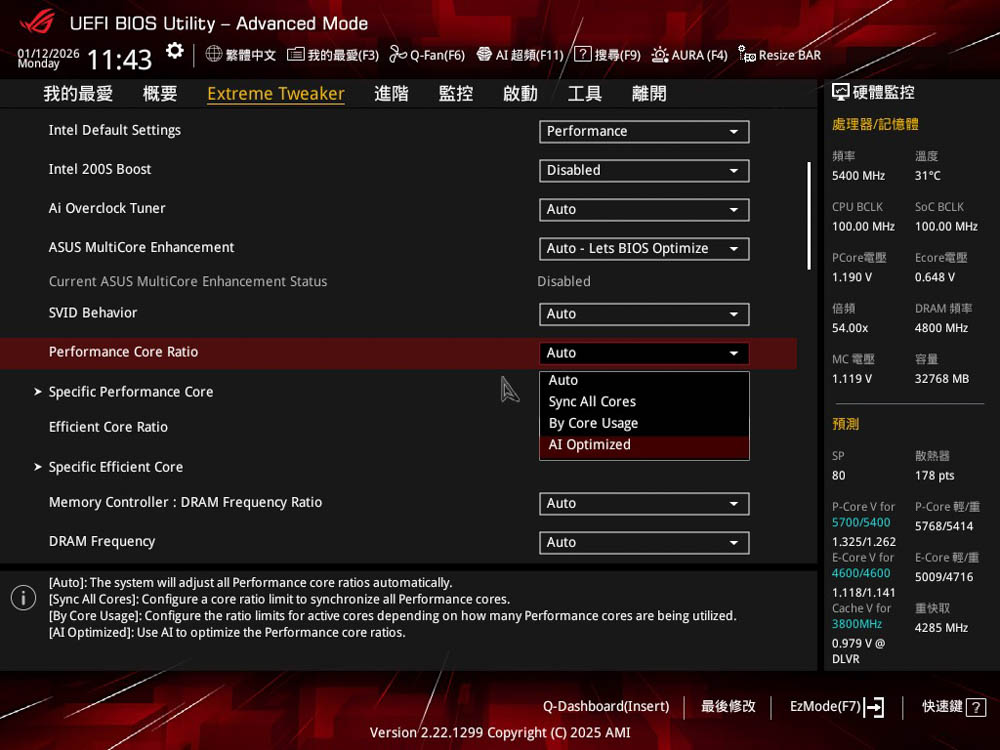 核心超頻方面,有著 Performance / Efficient Core Ratio選項,即P / E-core 核心調整,可提供全核、單核,以及獨家 AI Optimized 模式來進行超頻調整。