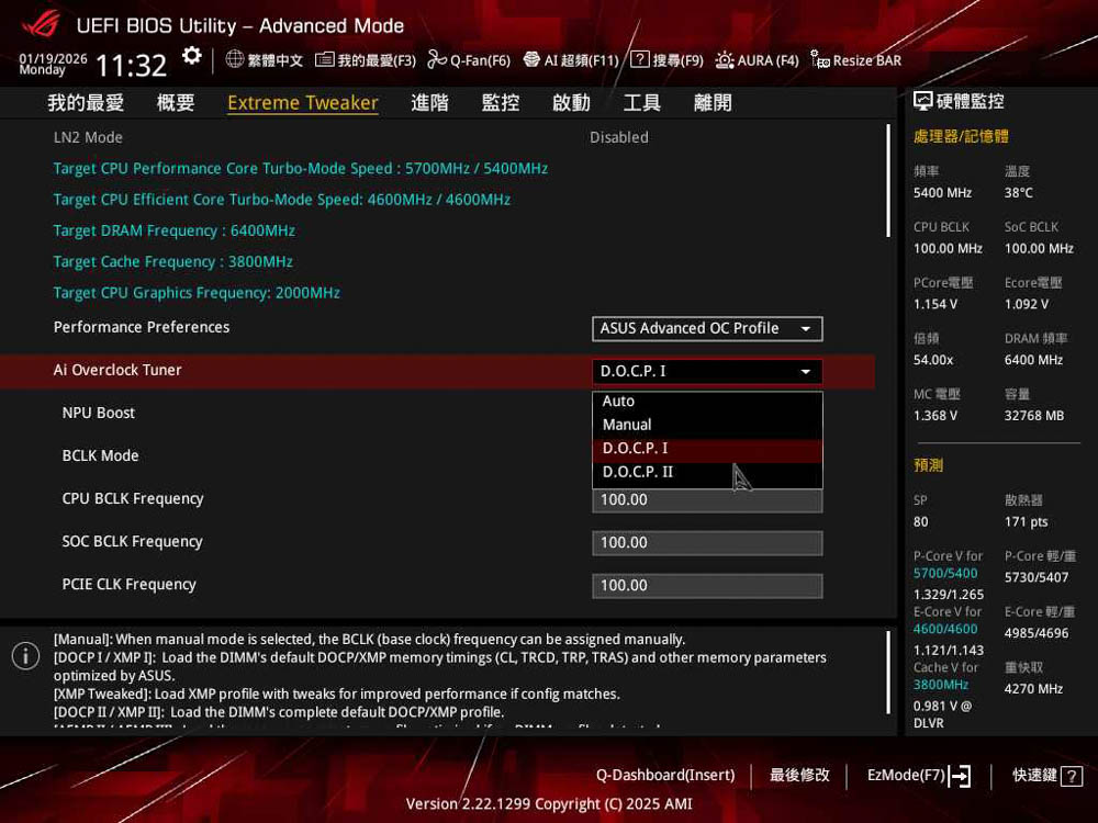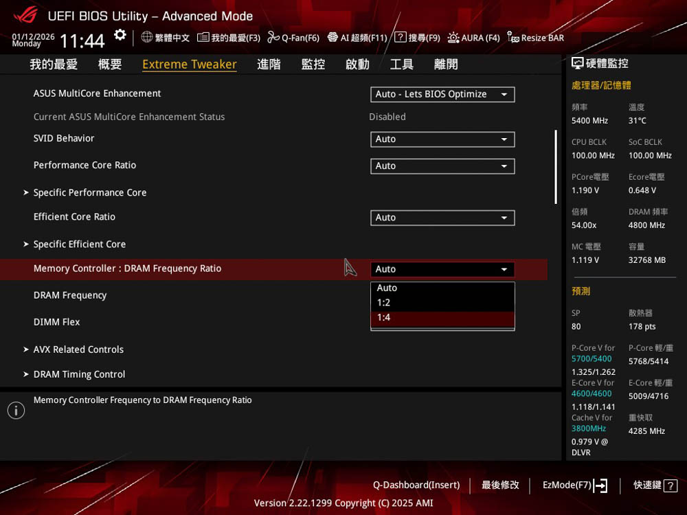 記憶體超頻,則有著常見 D.O.C.P 選項,分有 D.O.C.P 2 完全套用XMP預設參數,以及D.O.C.P 1只套用特定XMP參數 (CL、TRCD、TRP、TRAS),並加入ROG獨家優化的其他參數來設定;此外,還有Memory Controller:DRAM 選項可調整,提供 1:2 、1:4 模式設定。