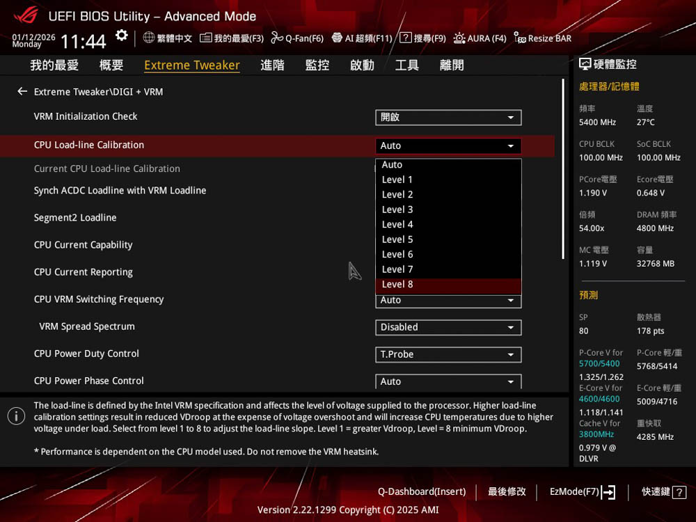 ↑ Extreme Tweaker \ DIGI+ VRM, CPU 負載補償設定,提供有8個等級檔位。