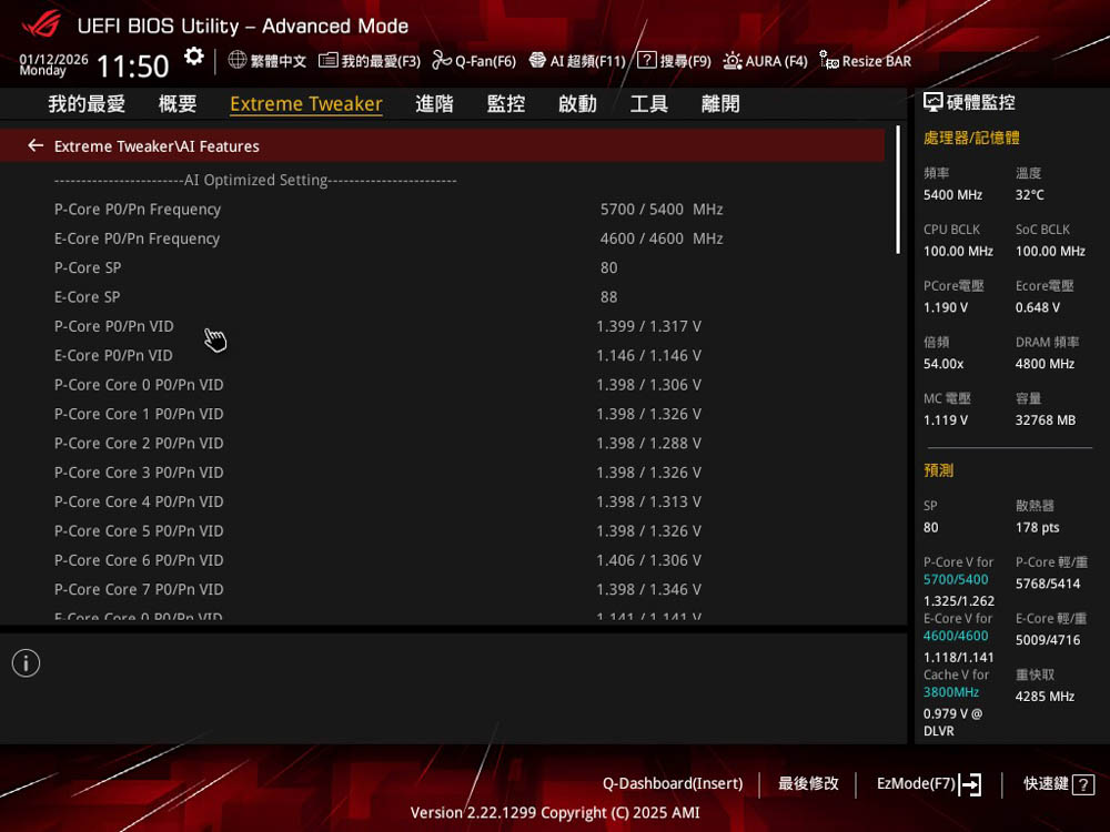 ↑ Extreme Tweaker \ AI Features,測試 285K有著 P-core 80 SP、E-core 88 SP分數成績。