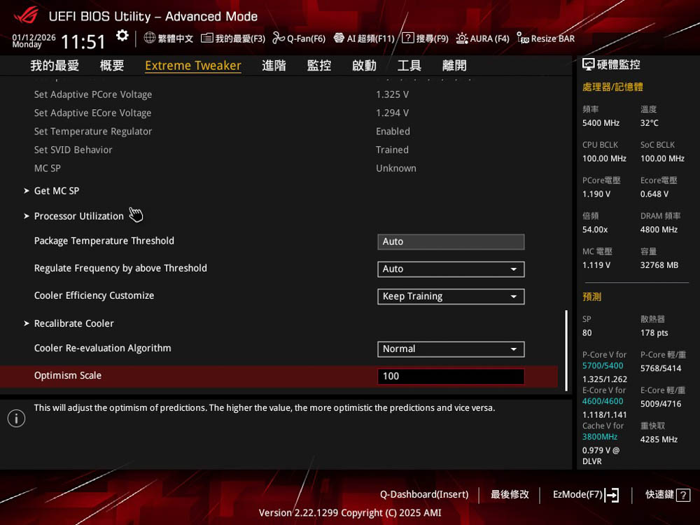 而常見「AI Features」群組選項 ,除了可檢查自己處理器的 SP 排行,以及啟用AI Optimized超頻下,P / E-core大小核的時脈設定;還有著「Cooler Re-evaluation Algorithm」、「Optimism」選項設定,可讓玩家調整AI模型對於處理器超頻的評估次數、樂觀程度,進而取得更精確超頻參數。