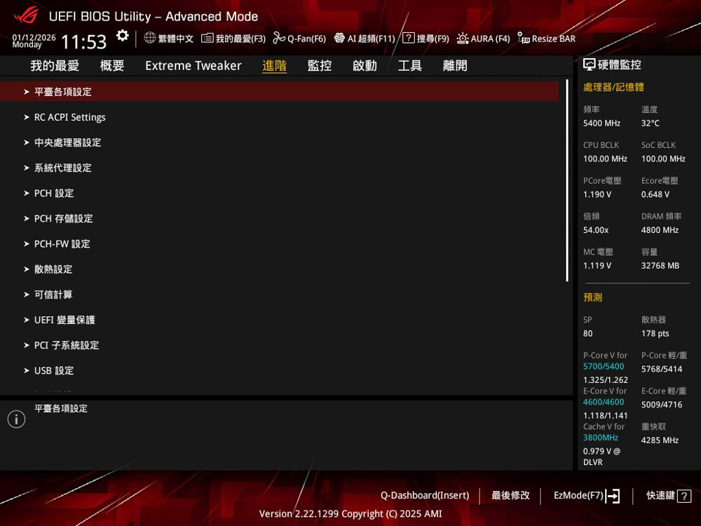 接著按下鍵盤F7或右上角按鈕,即可切為進階模式,該模式下有著相對豐富的參數選項,概要、Extreme Tweaker 超頻設定、進階、監控、啟動、工具、離開等頁面群組;而「Extreme Tweaker」頁面,提供各項處理器、記憶體相關時脈、電壓等超頻設定。
