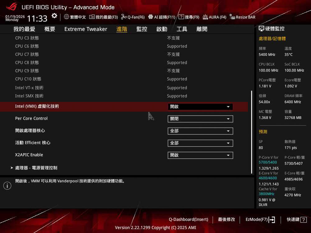 ↑ 進階 \ 中央處理器設定,可找到 Intel (VMX) Virtualization Technology 功能設定。