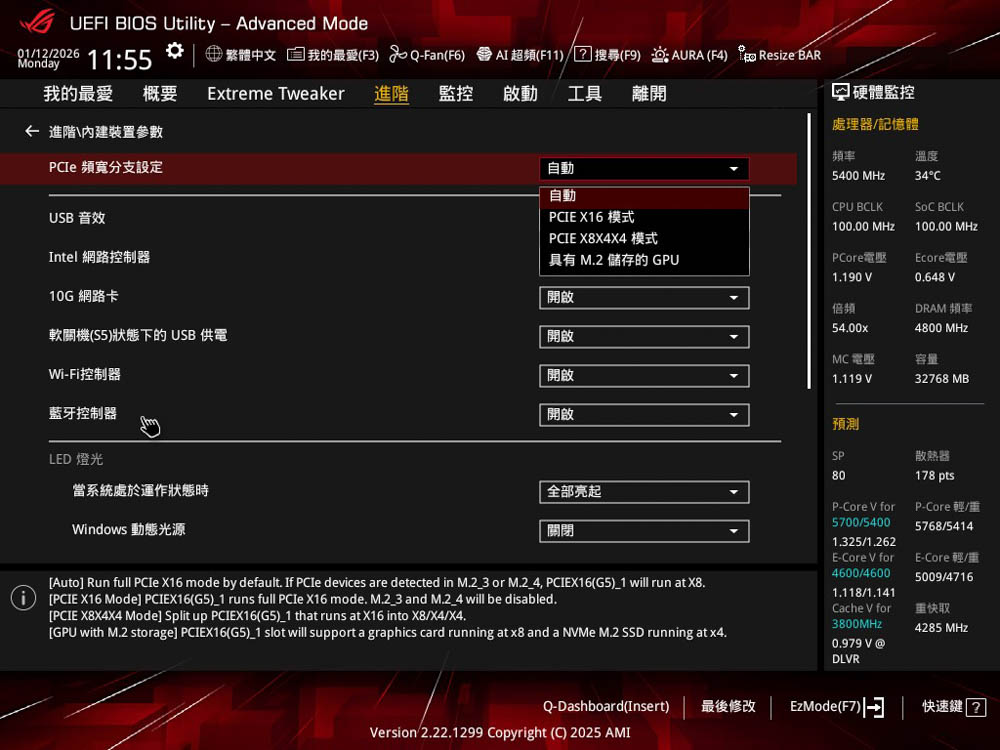 ↑ 進階 \ 內建裝置參數 (Onboard Devices Configuration),提供PCIe 通道拆分、裝置開關設定 。