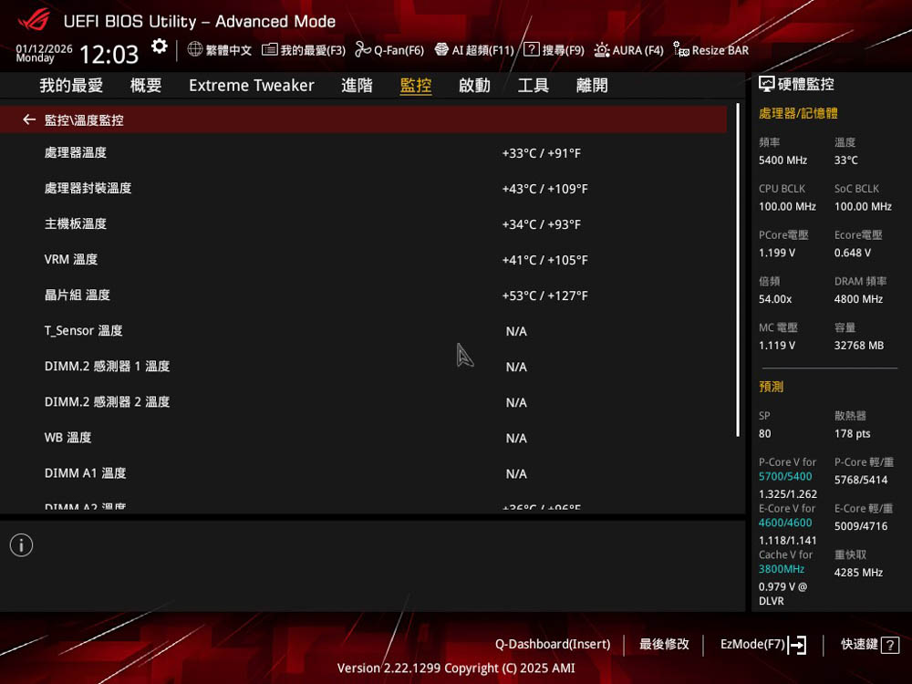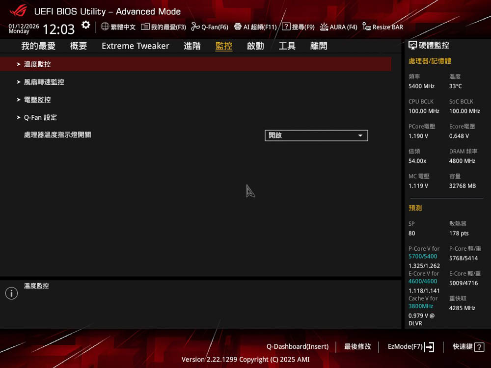 監控頁面,可以檢查當前安裝硬體的溫度與電壓資訊,如處理器、記憶體、晶片組等感測數據;並且提供更全面 Q-Fan 設定, 可讓玩家針對風扇與水泵轉速做細節上調整。
