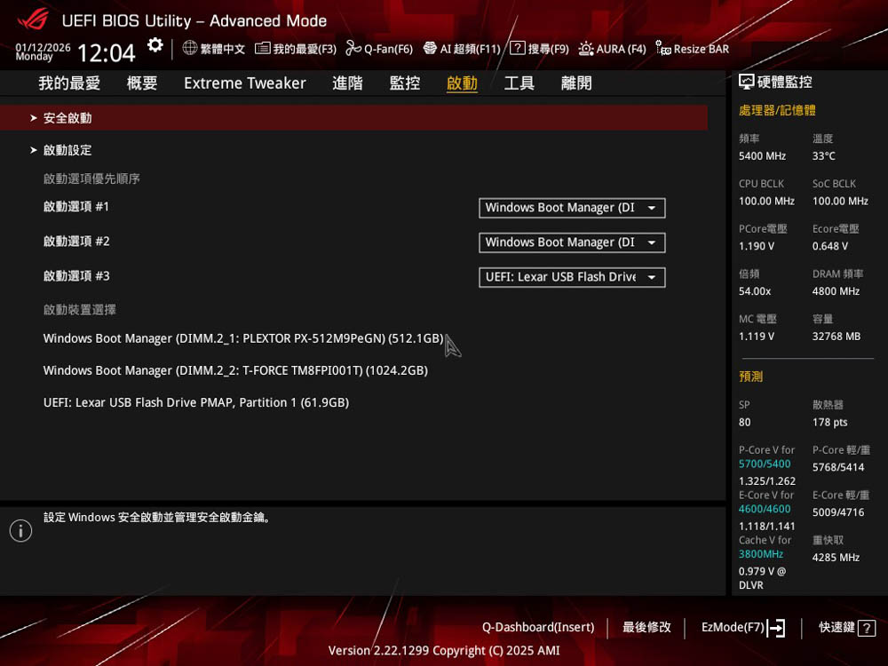 ↑ 啟動頁面,也可找到安全啟動 (Secure Boot) 功能。