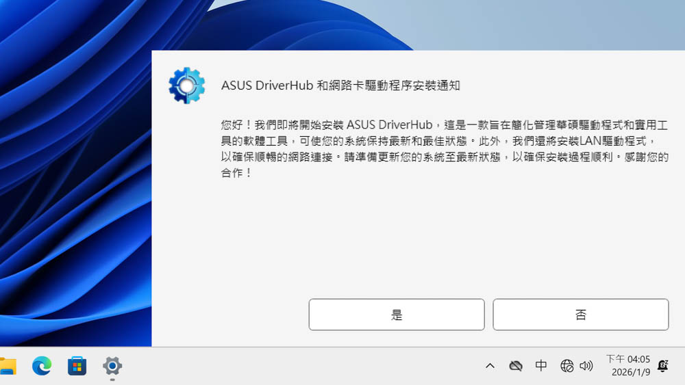 ↑ 剛開機進系統時,會彈出ASUS DriverHub提示。