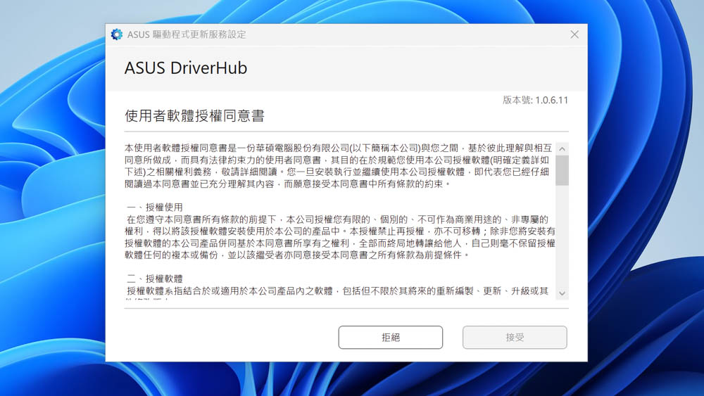 ↑ ASUS DriverHub授權同意書,按下「接受」後,隨即跳至使用介面 (網頁)。