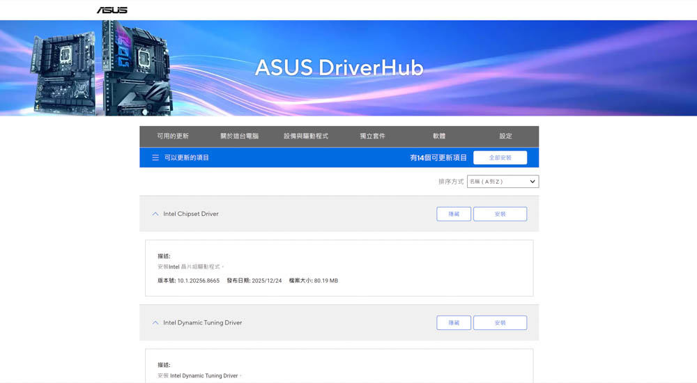 ↑ ASUS DriverHub 使用介面,已把主板相關驅動整合,方便玩家下載安裝。