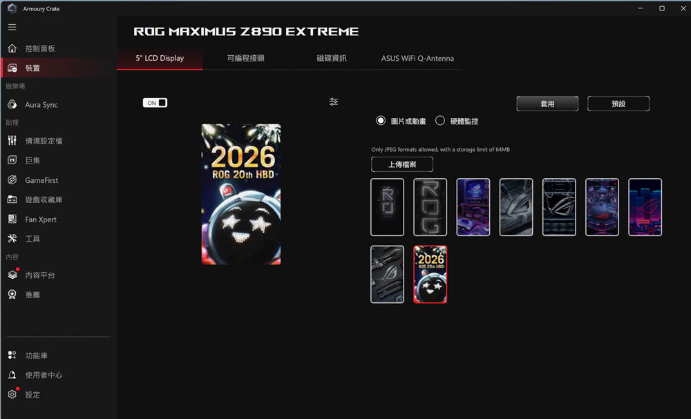 透過ROG 本家 Armoury Crate 軟體,可針對LCD 螢幕做個人化顯示調整,提供有靜動態圖片、硬體監控功能可選,也支援玩家上傳 JPEG 圖檔,但不支援 GIF 或 MP4 等動態影像,則略顯可惜;並且也提供 ARGB (可編程) 接頭、硬碟資訊、WiFi Q-Antenna等相關檢閱與可調功能。