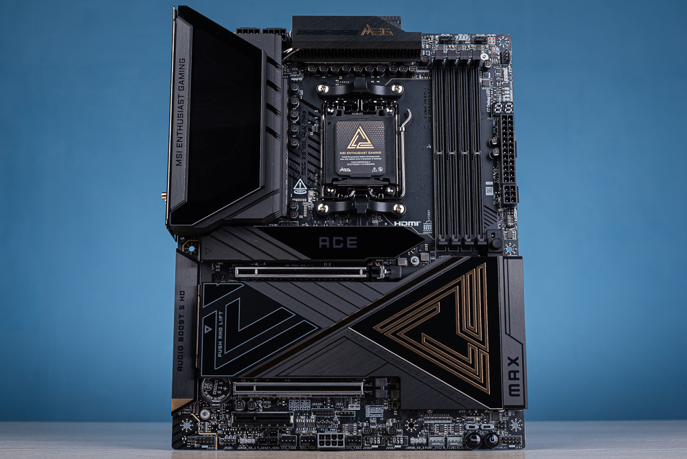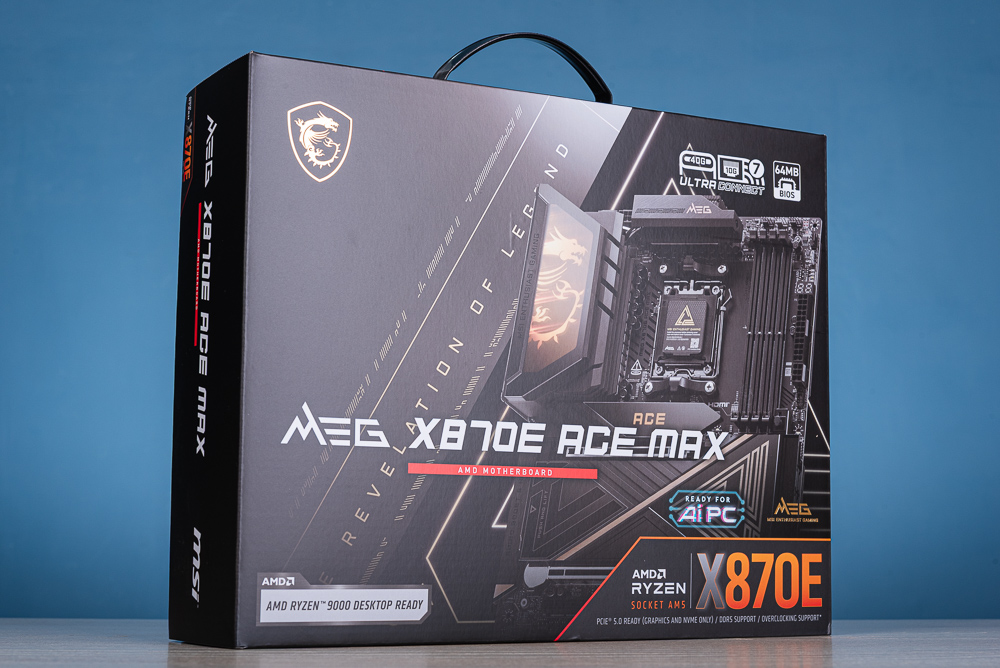 ↑ MEG X870E ACE MAX 外觀以沈穩低調的黑色搭配金色 MEG 字樣與標誌點綴。