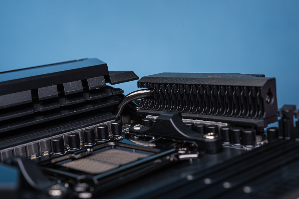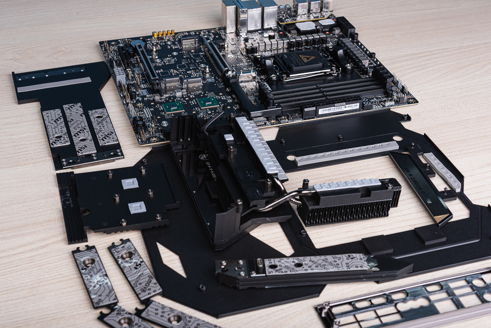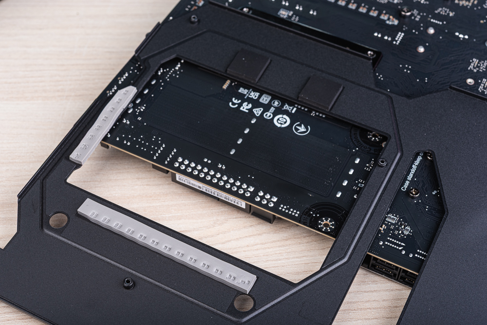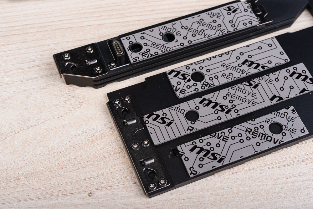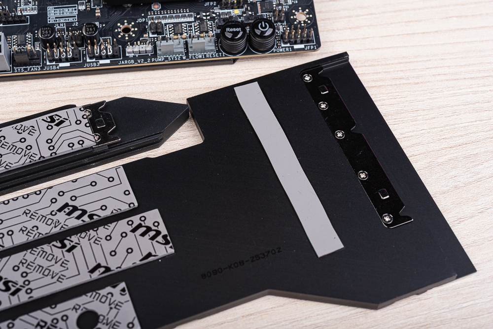 此外,M.2_3、M.2_4 與 M.2_5 都使用晶片組的 PCIe 4.0 x4 通道;而 SSD 除了表面的散熱器之外,在底部一樣備有導熱墊與背板。