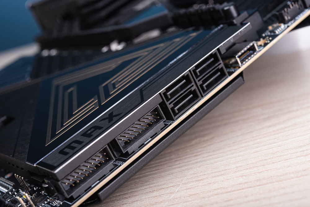 主板右下角則有著前置 USB 20Gbps Type-C(支援 60W 快充)、4 個 SATA 與 2 個 USB 5Gbps 擴充連接埠。