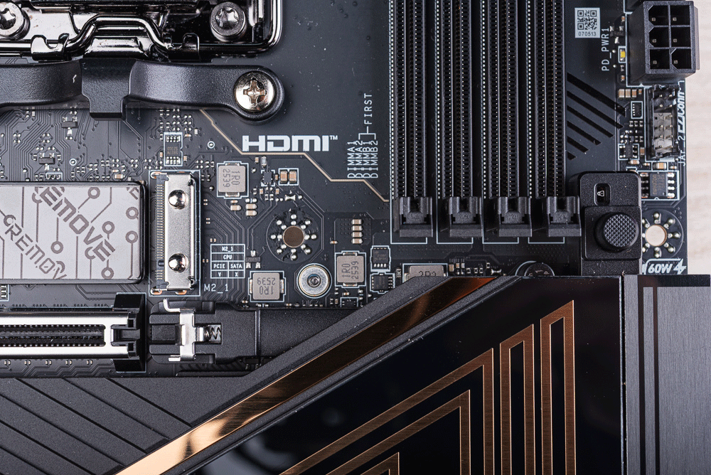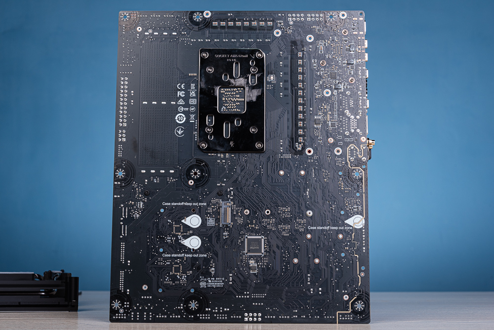 主板右上角有著 4 DIMM DDR5 記憶體插槽,支援最大 256GB 容量與 1DPC 1R 最高 8400+ MT/s 超頻可能;並在金屬背板後方增加橡膠墊,確保記憶體插入插槽時電路板不至於彎曲,並提供 High-Efficiency Mode 調整記憶體時序,以及 Latency Killer 降低記憶體延遲。