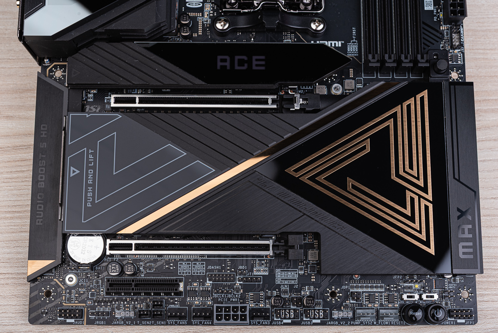 MEG X870E ACE MAX 主機板,採用全黑電路板、散熱器搭配金色的 MEG 字樣與象徵者 MEG 旗艦極致玩家的金色三角形標誌;而左上角的 I/O 外殼在開機時,則會展現具備 Mystic Light 燈效的龍魂標誌;主板正中央的 M.2 散熱器則有著具備 RGB 燈效的 ACE 字樣。