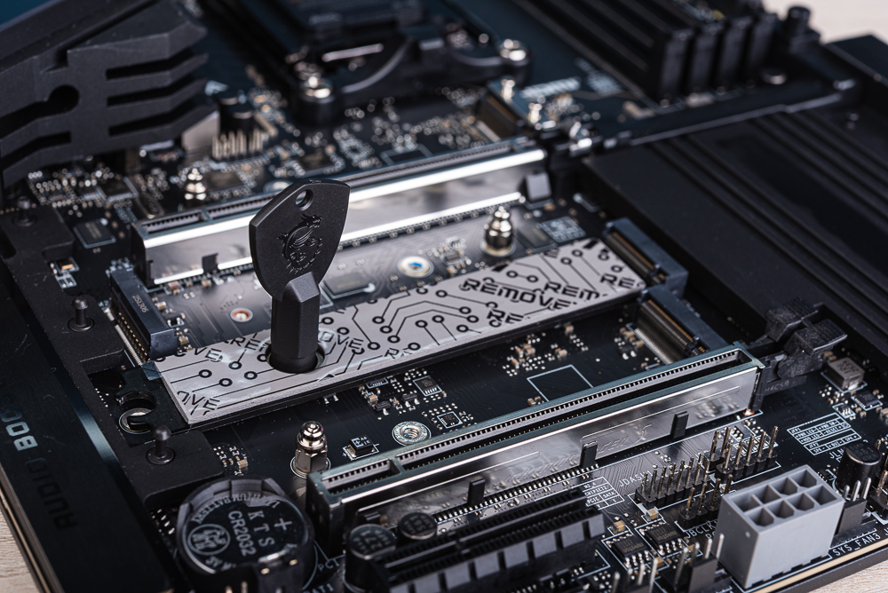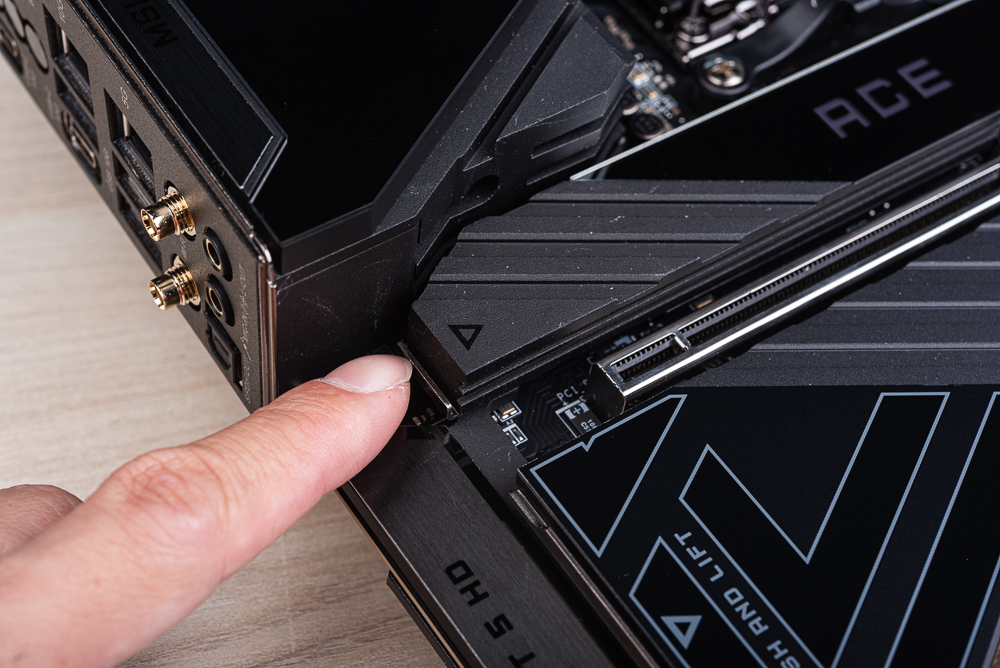 兩塊 M.2 散熱片,都採用 EZ M.2 Shield Frozr II 快拆設計,只要將散熱器左手邊的金屬往右推即可打開散熱器。