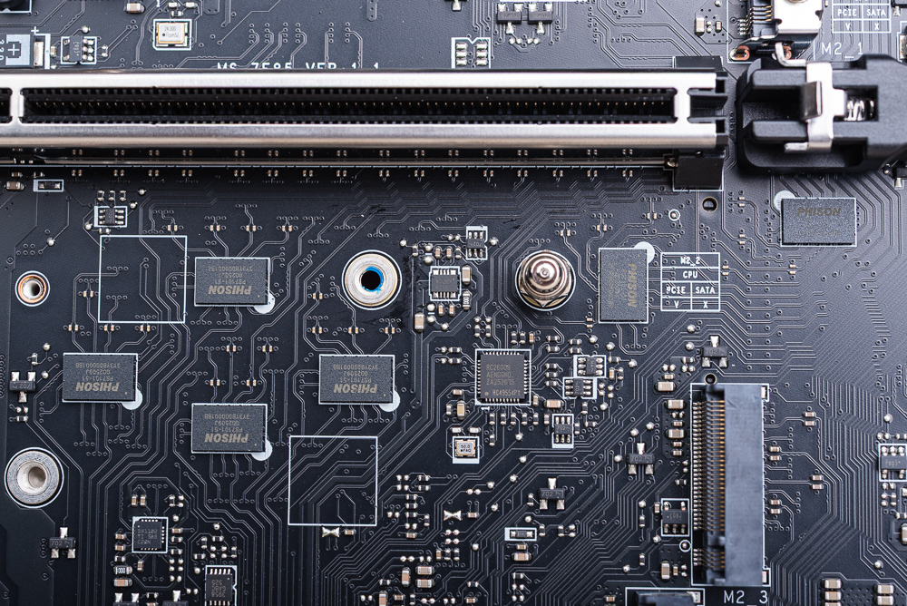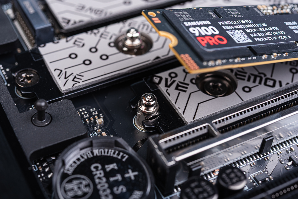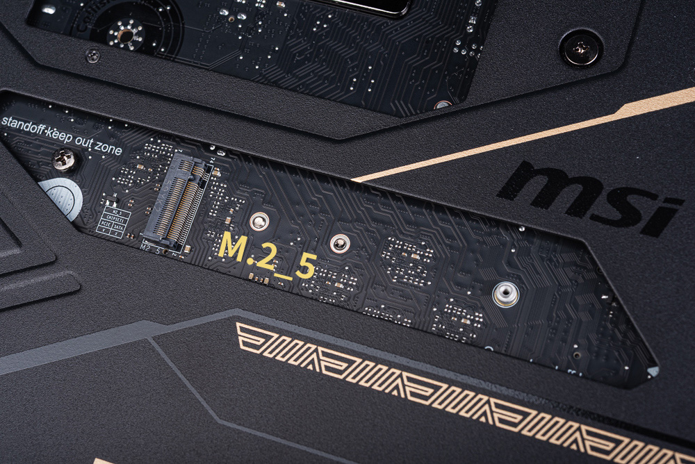 主板總共提供 5 個 M.2 插槽,由上而下依序分別是 M.2_1 / 2 / 3 / 4 與在背面的 M.2_5。首先 M.2_1 與 M.2_2 都採用 CPU 提供的 PCIe 5.0 x4 通道;只不過 M.2_1 與上述 PCI_E3 共用通道,而 M.2_2 則與 USB4 共用通道,雖說都可同時共用但玩家一樣可在 BIOS 中調整通道分配。