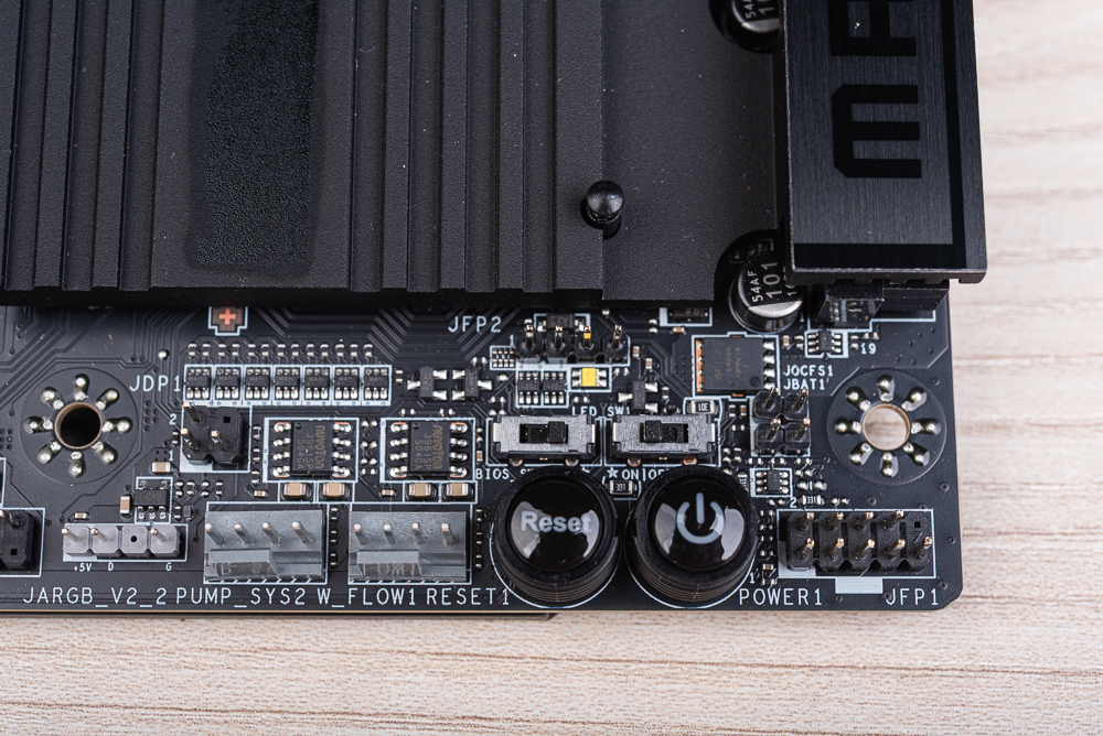 ↑ 開機、Reset 按鈕。以及雙 BIOS 切換開關、LED On/Off 開關。